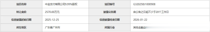 本次转让项目信息还披露了中金支付近年的主要财务数据。数据显示,中金支付2024年度营业收入约为7.63亿元,净利润726.17万元;今年前10个月,中金支付营业收入约为4.53亿元,净利润223.55万元。